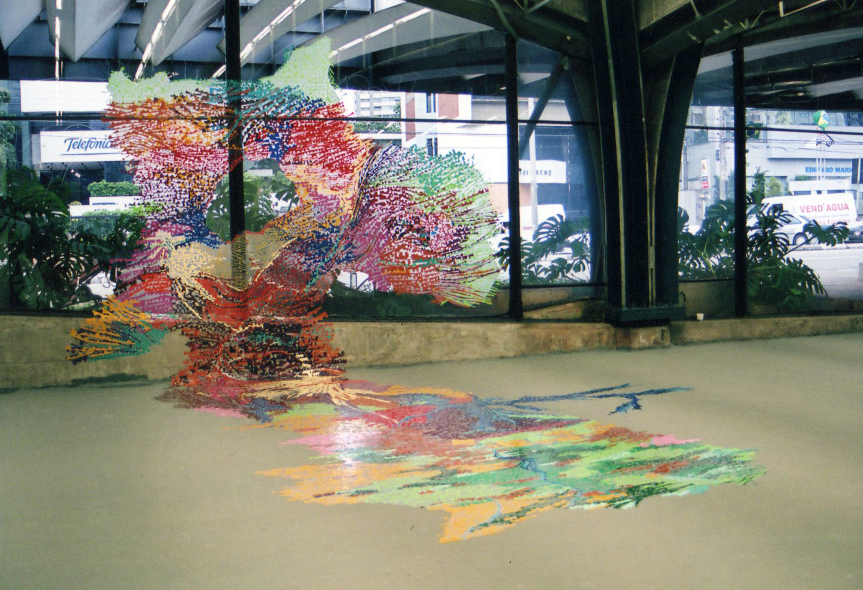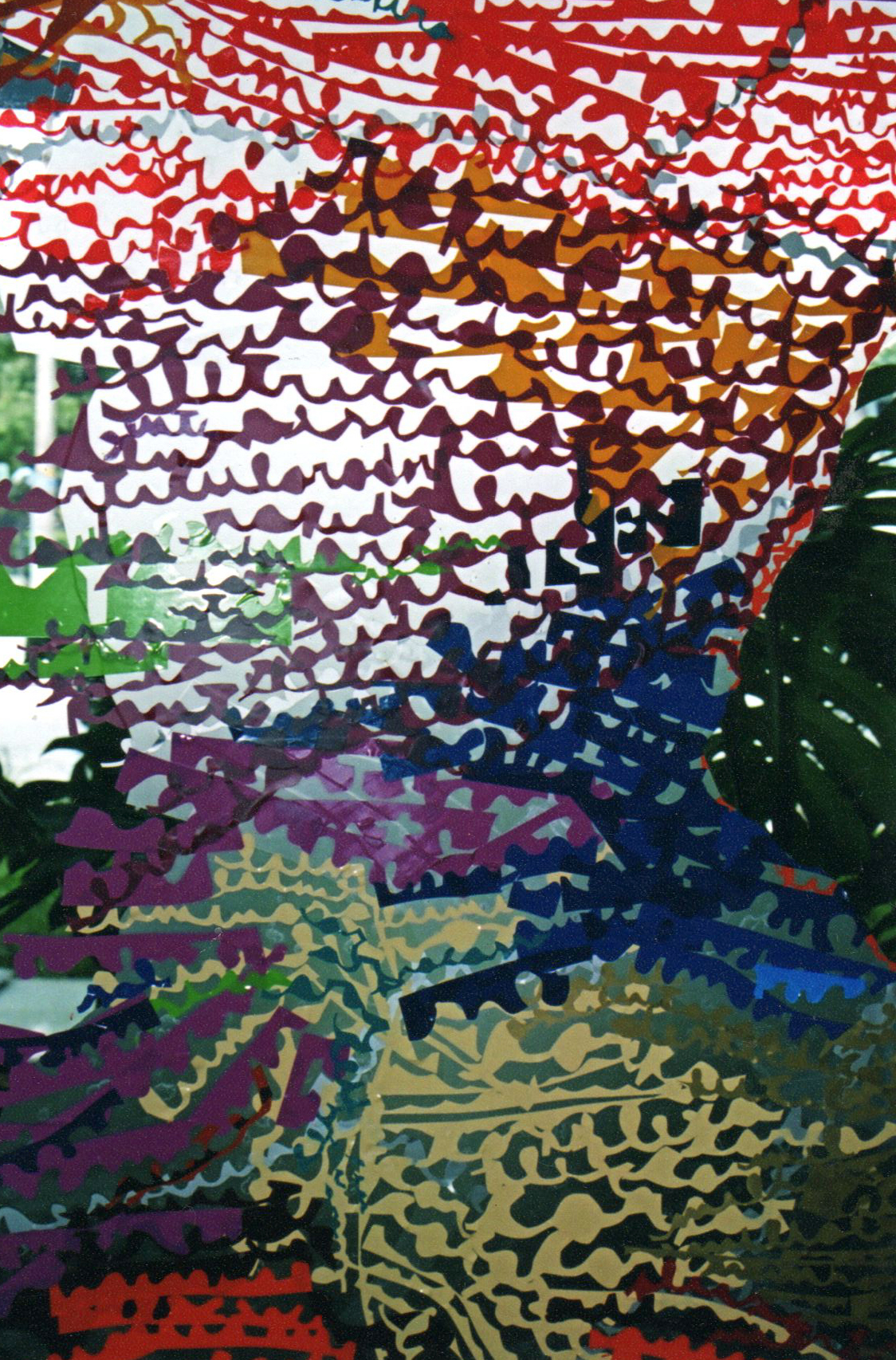 Vinil adesivo manualmente recortado e afixado sobre o chão e o vidro.