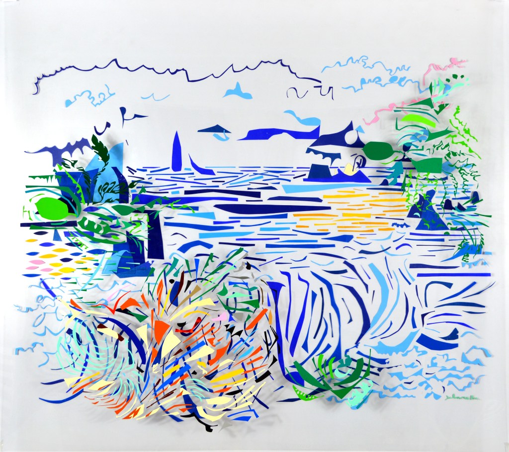 As paisagens desta série iniciada em 2020 são compostas por fragmentos plásticos, estilhaços de cor que constroem os planos pictóricos a partir da construção de espaços, vãos entre as formas. O ato de juntar, de classificar, de nomear e de ordenar os fragmentos de cor tem sido a estratégia da artista para lidar com o vestígio, o resto. Dado destaque para a relação entre as imagens, os títulos e o material plástico utilizado, observa-se uma fricção entre estes aspectos visuais, materiais e a nomeação de situações de degradação ambiental.