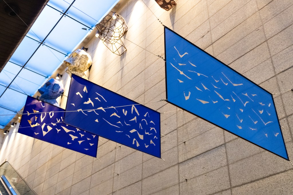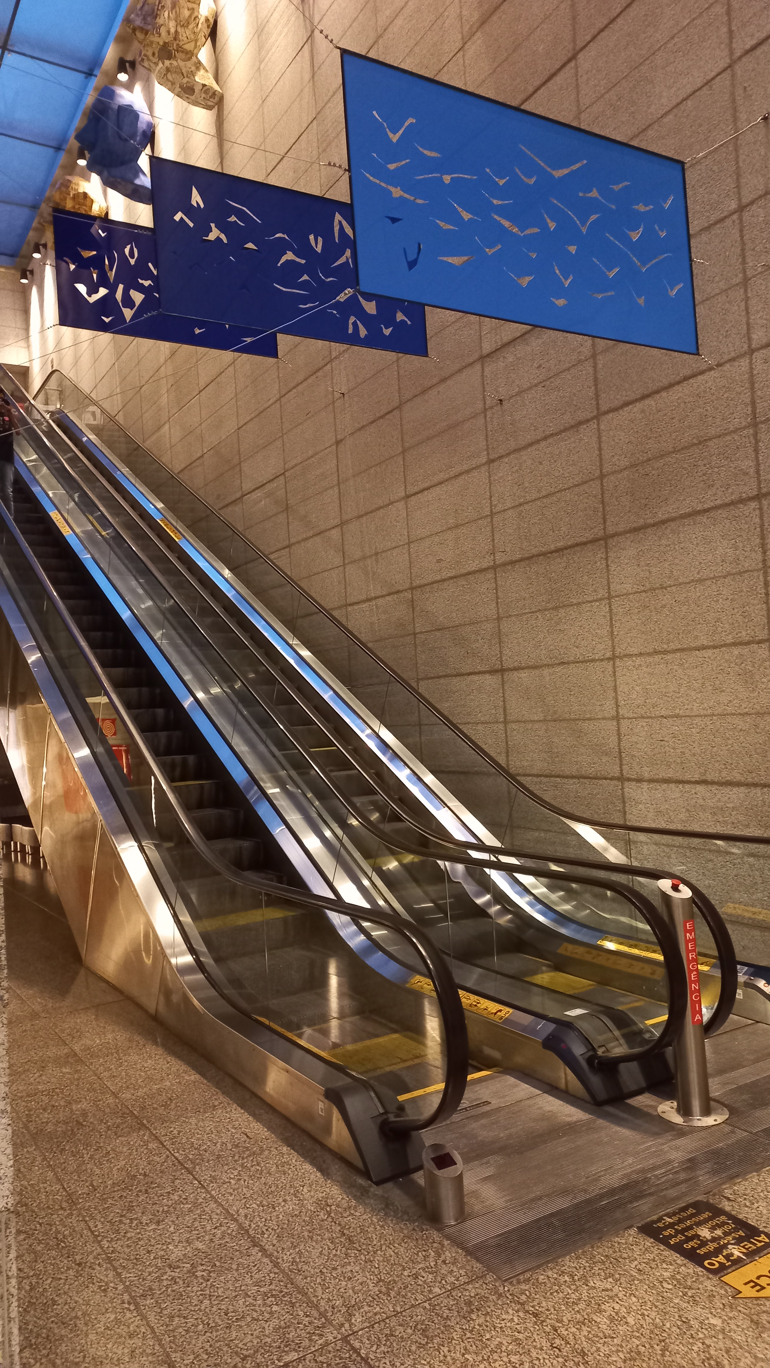 Voos aborda a coletividade em uma revoada composta por diferentes tipos de pássaros, fictícios e reais, recortados e vazados em três placas de acrílico azul, paralelas. Suspensos sobre a escada rolante, as perfurações das placas são atravessadas pela corrente de ar que circula entre os dois pisos do Sesc Palladium. A obra é acompanhada de uma paisagem sonora, colocada debaixo da escada e pode ser escutada no trajeto de um piso para o outro. Composta por sons sintetizados que nos remetem ao som de pássaros, a sinfonia amplifica a experiência do espectador. A sensação de levantar voo e de aterrissagem é sugerida pelo movimento da escada rolante.