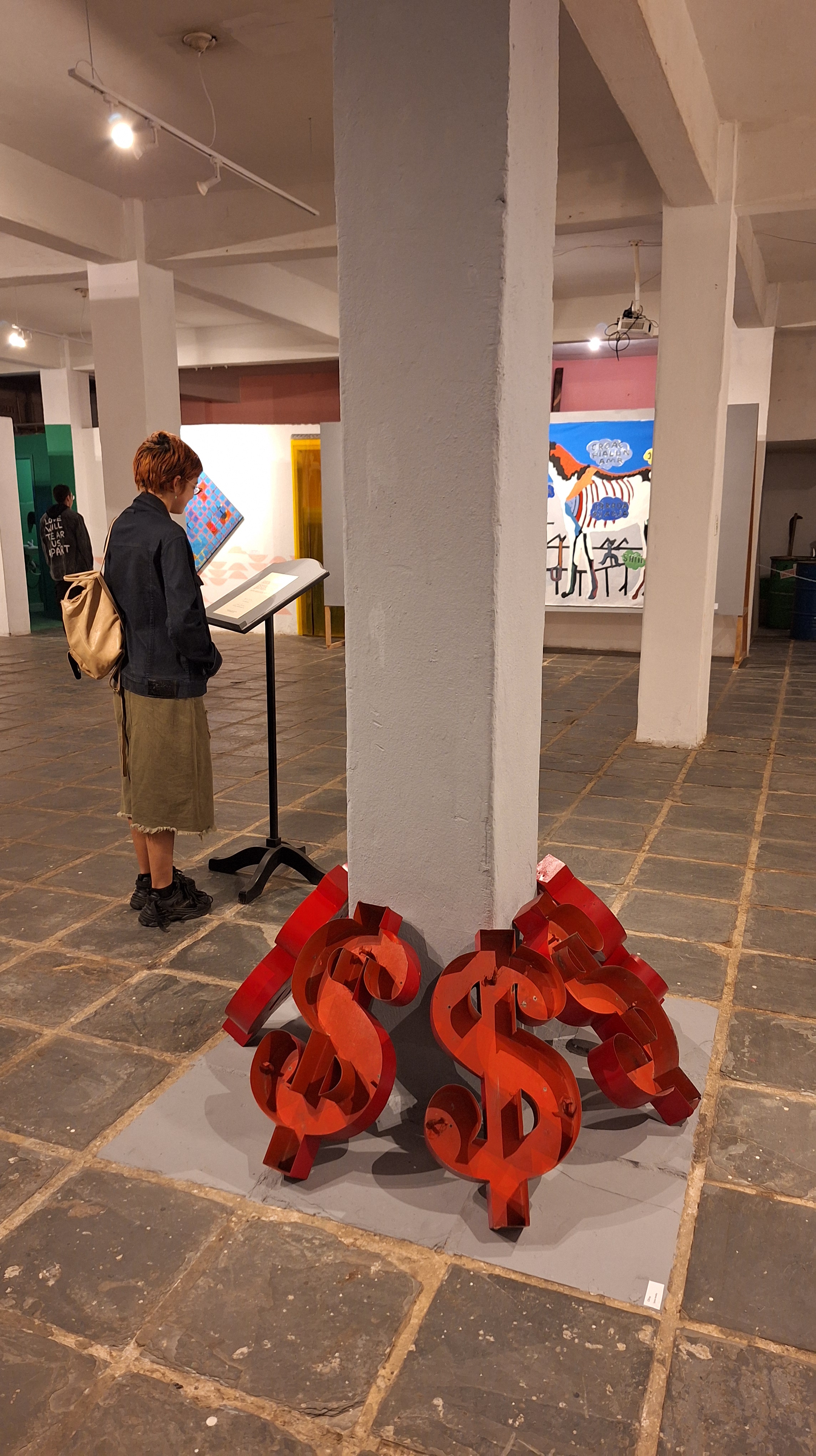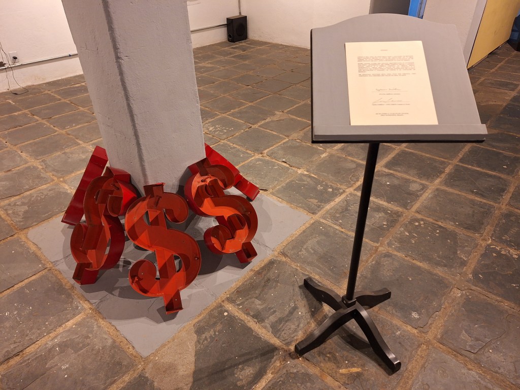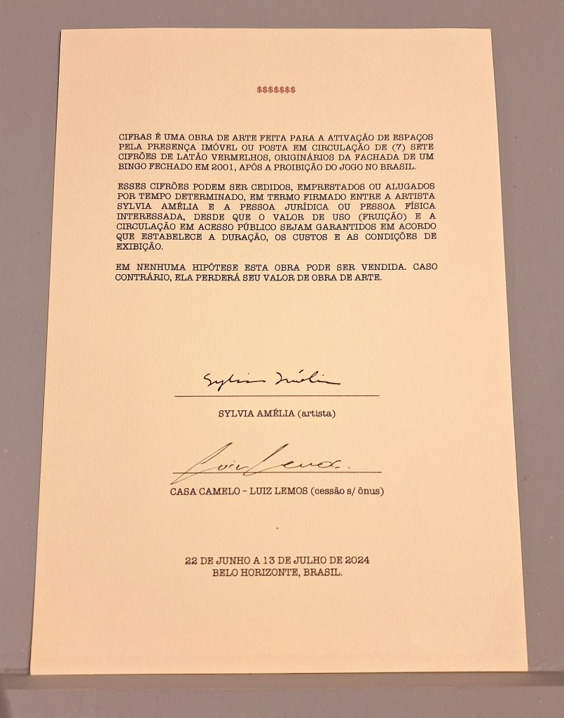 Atualizado para o momento político brasileiro de 2024, com a rediscussão do fim da proibição de jogos no Brasil, os cifrões foram montados em torno de uma das pilastras estruturais do espaço. Juntamente com as 7 peças, um termo de uso determina que em nenhuma hipótese a obra poderá ser vendida. “Caso contrário ela perdera seu valor de obra de arte”.