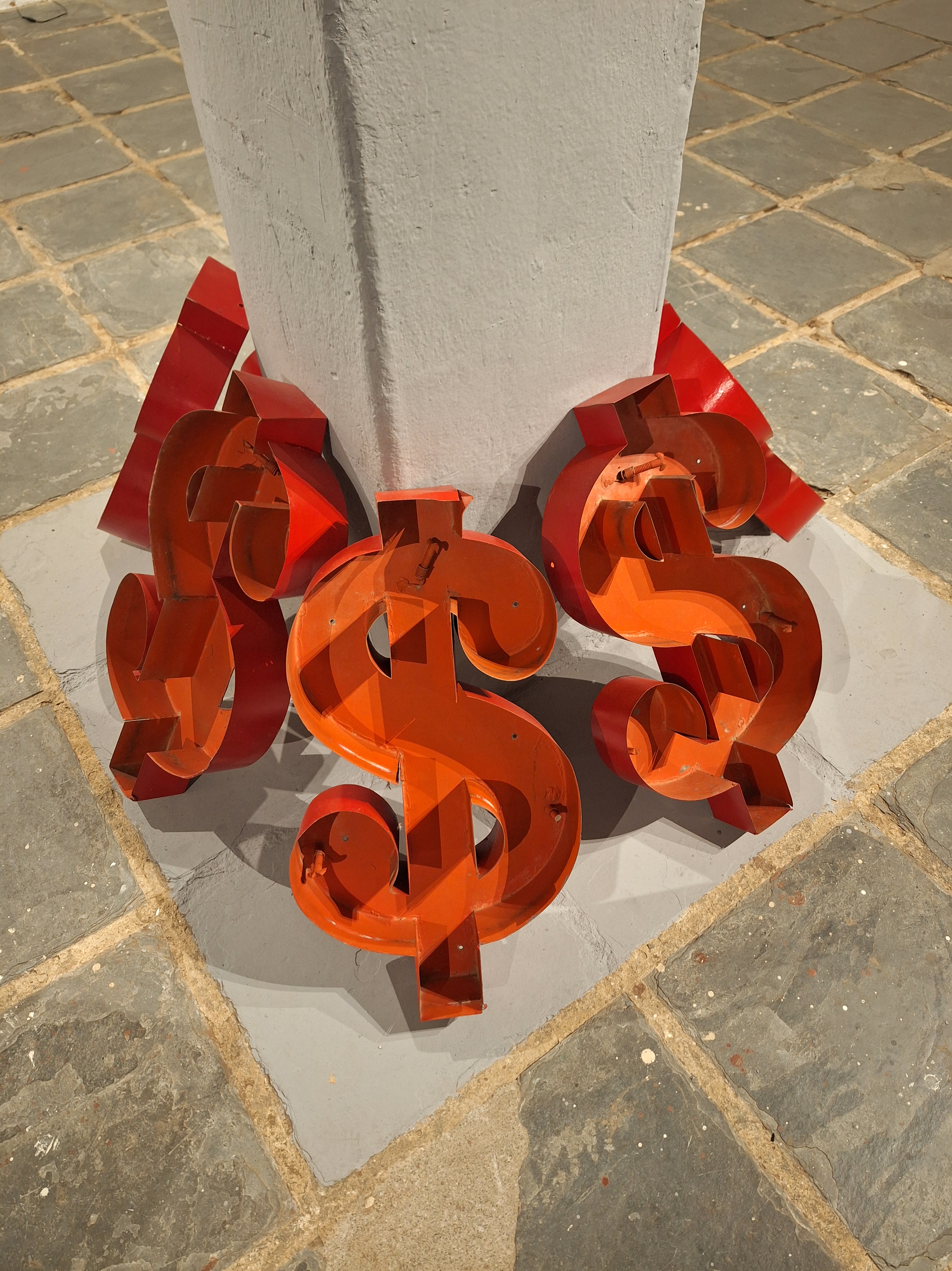 7 cifrões vermelhos de latão (70 x 45 cm cada) apoiados sobre pilastra e chão pintados de cinza,