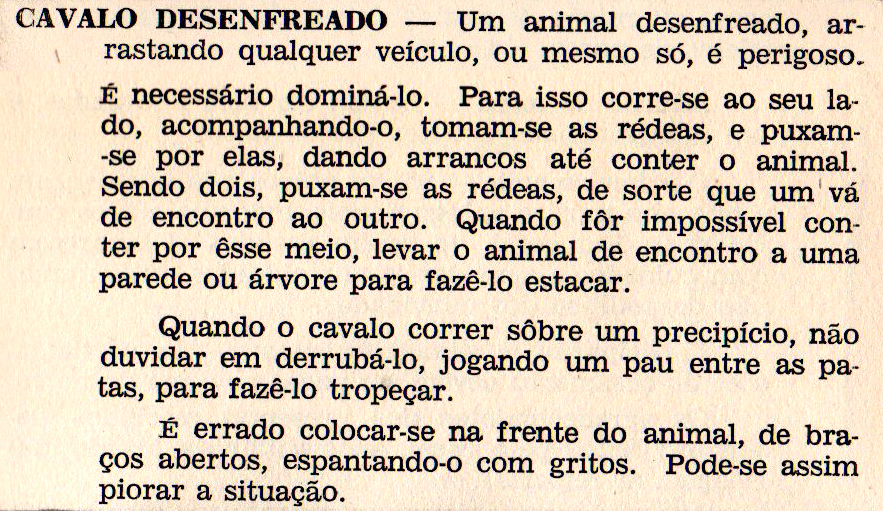 CAVALOS DESENFREADO é o verbete onde encontramos uma prescrição que escapa às regras do manual. Em uma atitude singular, lemos a imagem de uma mulher que precisa domar um animal desenfreado, por uma atitude aguerrida, aventurosa, além da destacada advertência de que no lugar da mocinha em perigo, ela não seria salva.