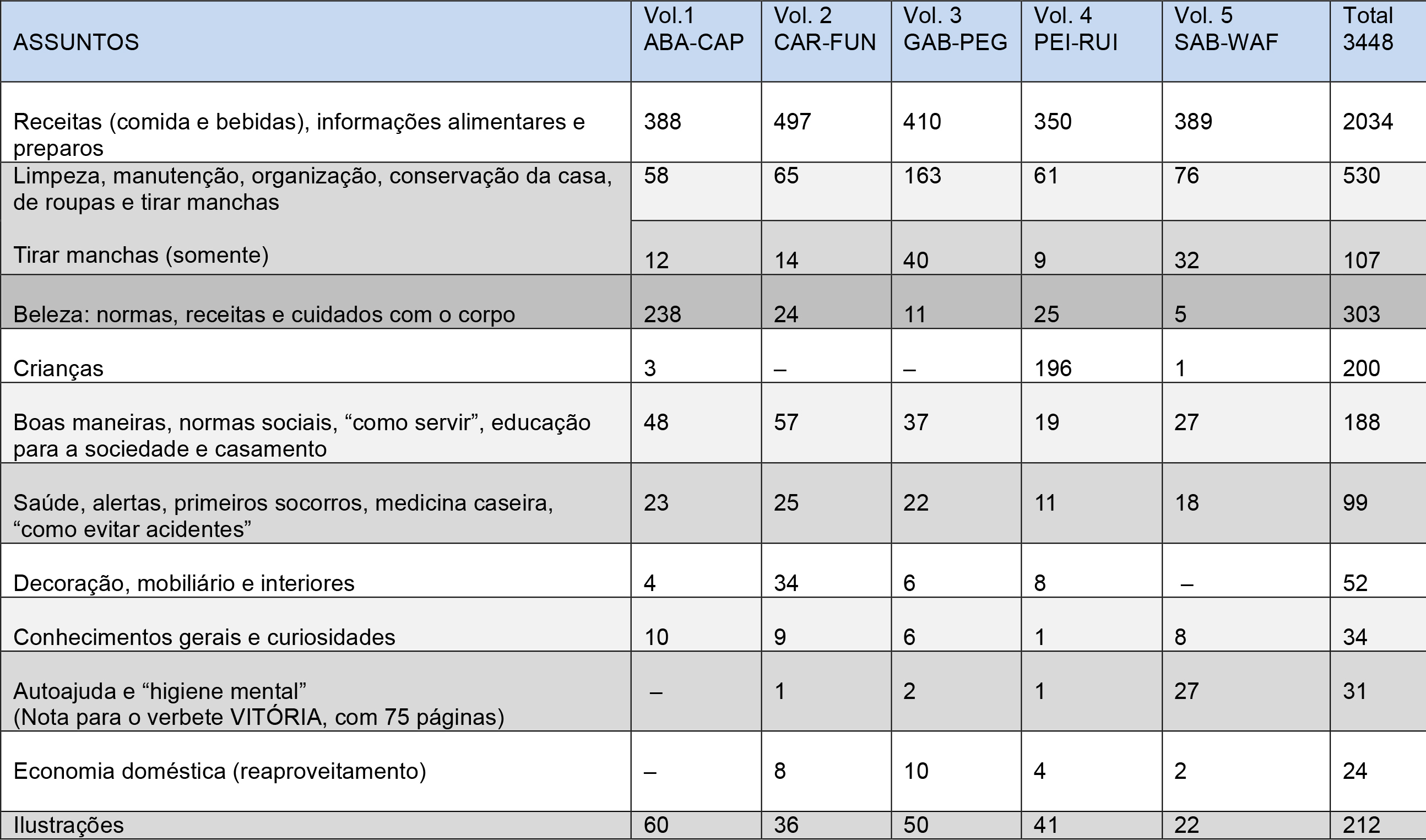 A análise e classificação do verbetes do Dicionário do Lar revela pela recorrência, o que constitui o horizonte de ocupação da mulher narrada, e identifica para onde seus esforços e atenções mais e menos se dirigem: