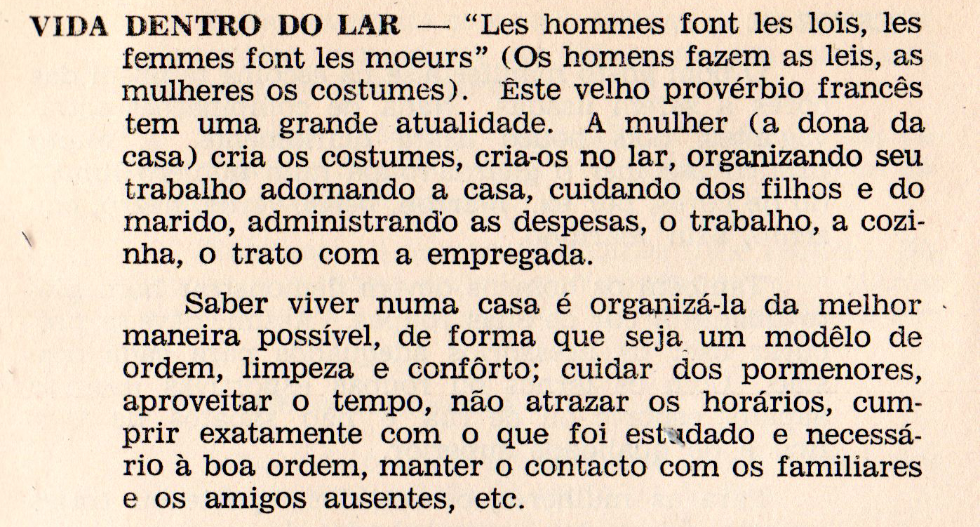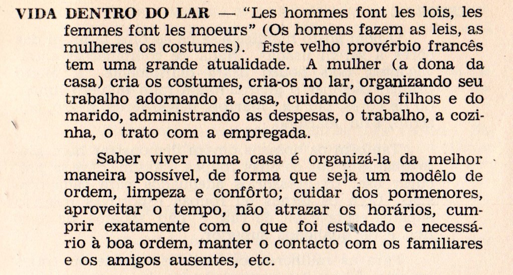 Importa enfatizar que a mulher descrita no Dicionário do Lar é uma representação, ela não existe como sujeito mas como produção de subjetividade. É o retrato do que se projeta mulher brasileira, de classe média, criada sob um regime educacional conservador e orientada para cumprir o seu “destino feminino”.