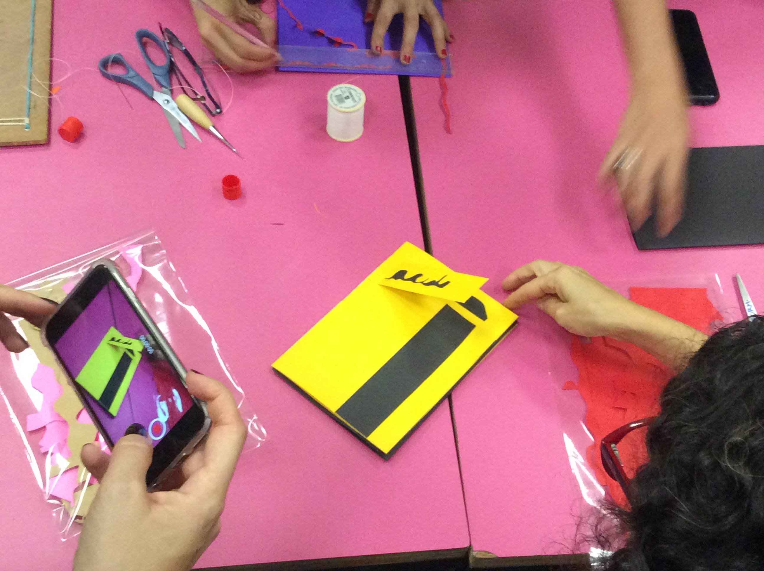 Último momento de edição: das duas palavras, escolher apenas uma; escolher também duas das cores de papel disponíveis. Agora seria o momento de produzirmos nossos livros, nos quais a palavra eleita se desdobra em possibilidades imagéticas, combinações de formas e contraformas. Interessante perceber como cada participante está preocupado em associar todos os elementos disponíveis para criar um resultado gráfico e estético. Há algo de provocativo, por exemplo, em “Lambida”, livro produzido por uma das participantes. Ali, a escolha das cores é um comentário irônico sobre masculinidades e feminilidades.
